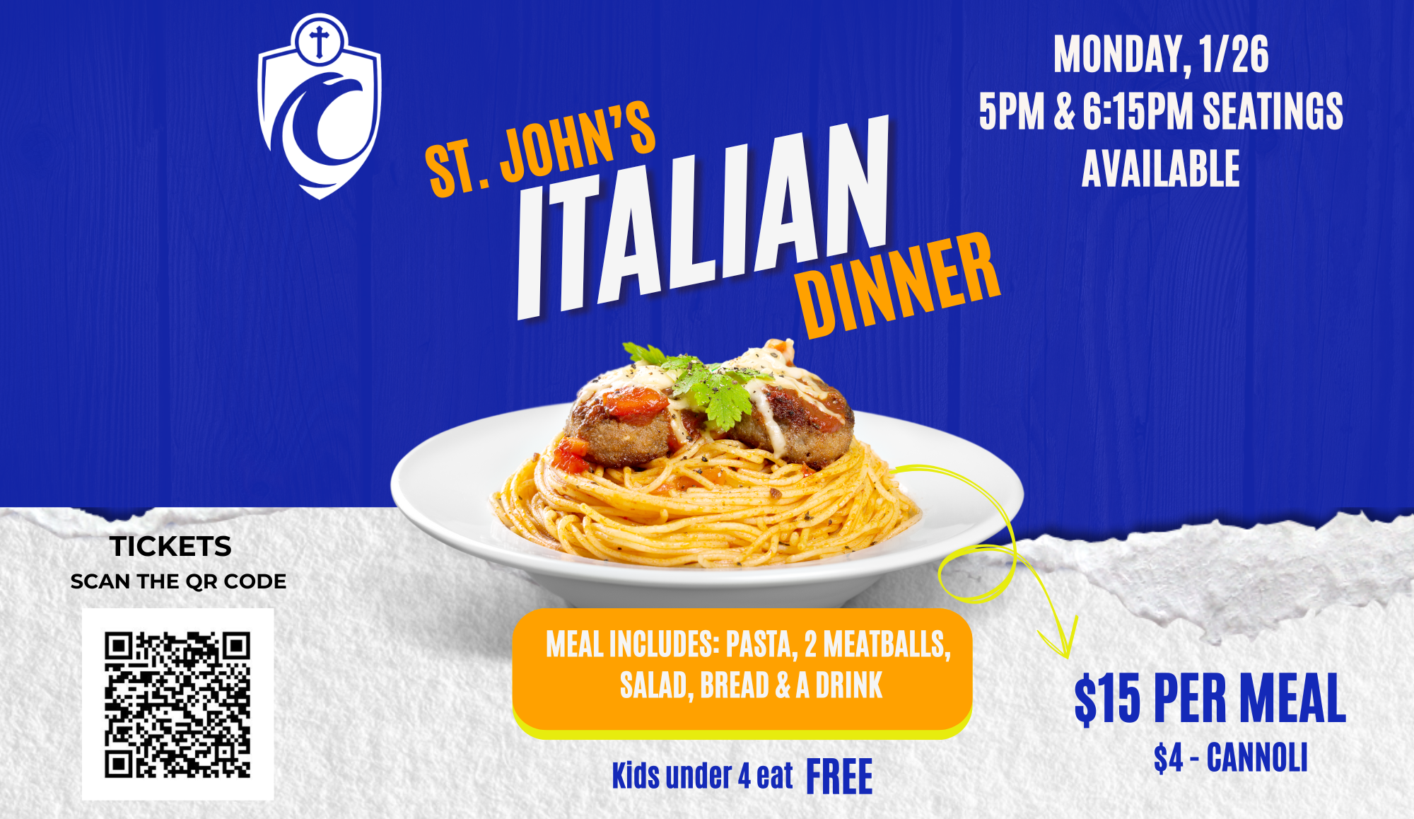 Choose the 5p.m. or 6:15p.m. seating and bring your whole family! For just $15 you’ll enjoy spaghetti stacked high and smothered in delicious sauce and two meatballs, a salad, bread, and drink! If you’re still hungry you can purchase a delicious cannoli for just $4. Kids under four eat free!